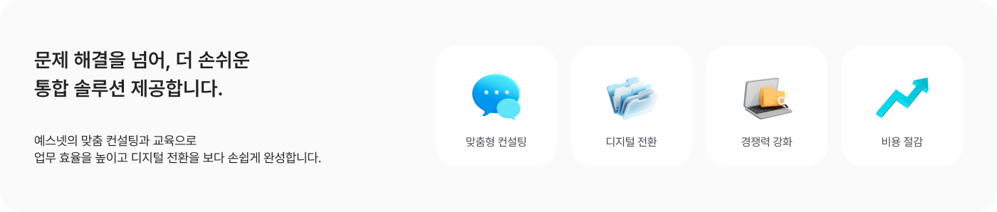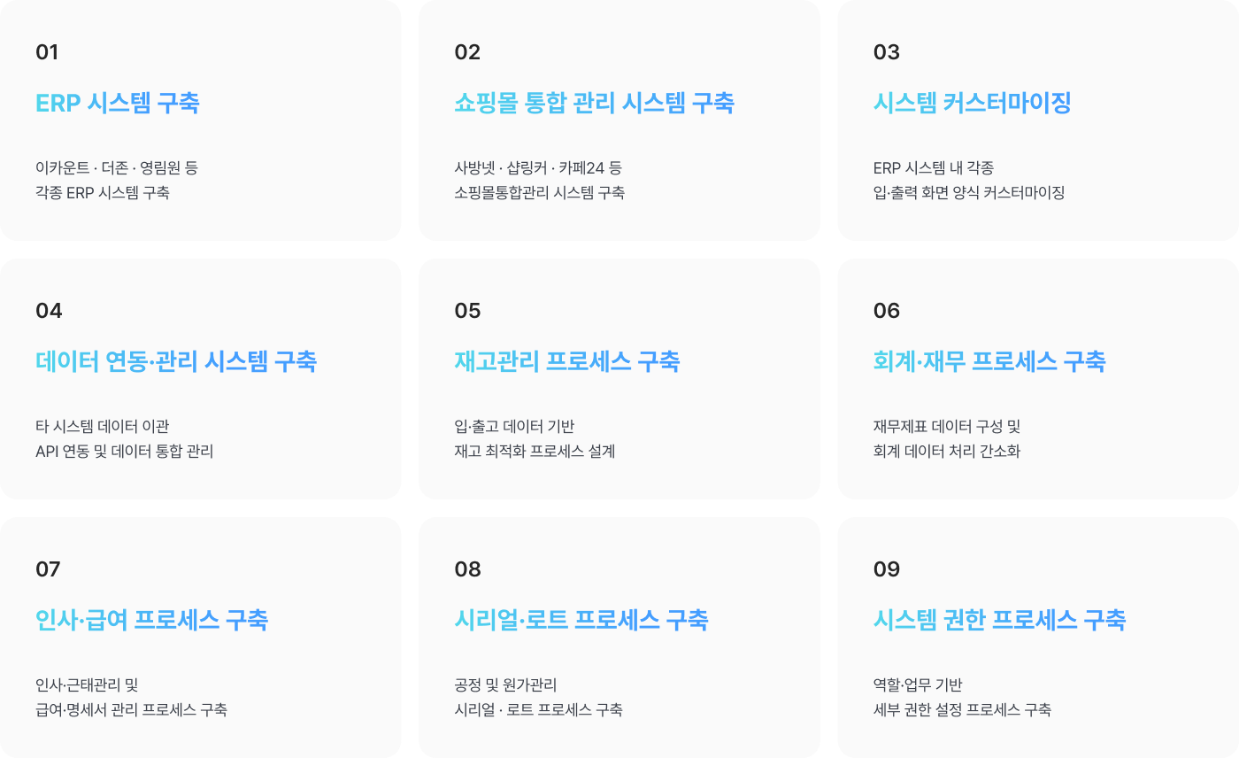 기업의 업무 흐름과 시스템 환경을 분석해ERP 컨설팅부터 구축·최적화·유지보수까지 전 과정을 함께합니다.
